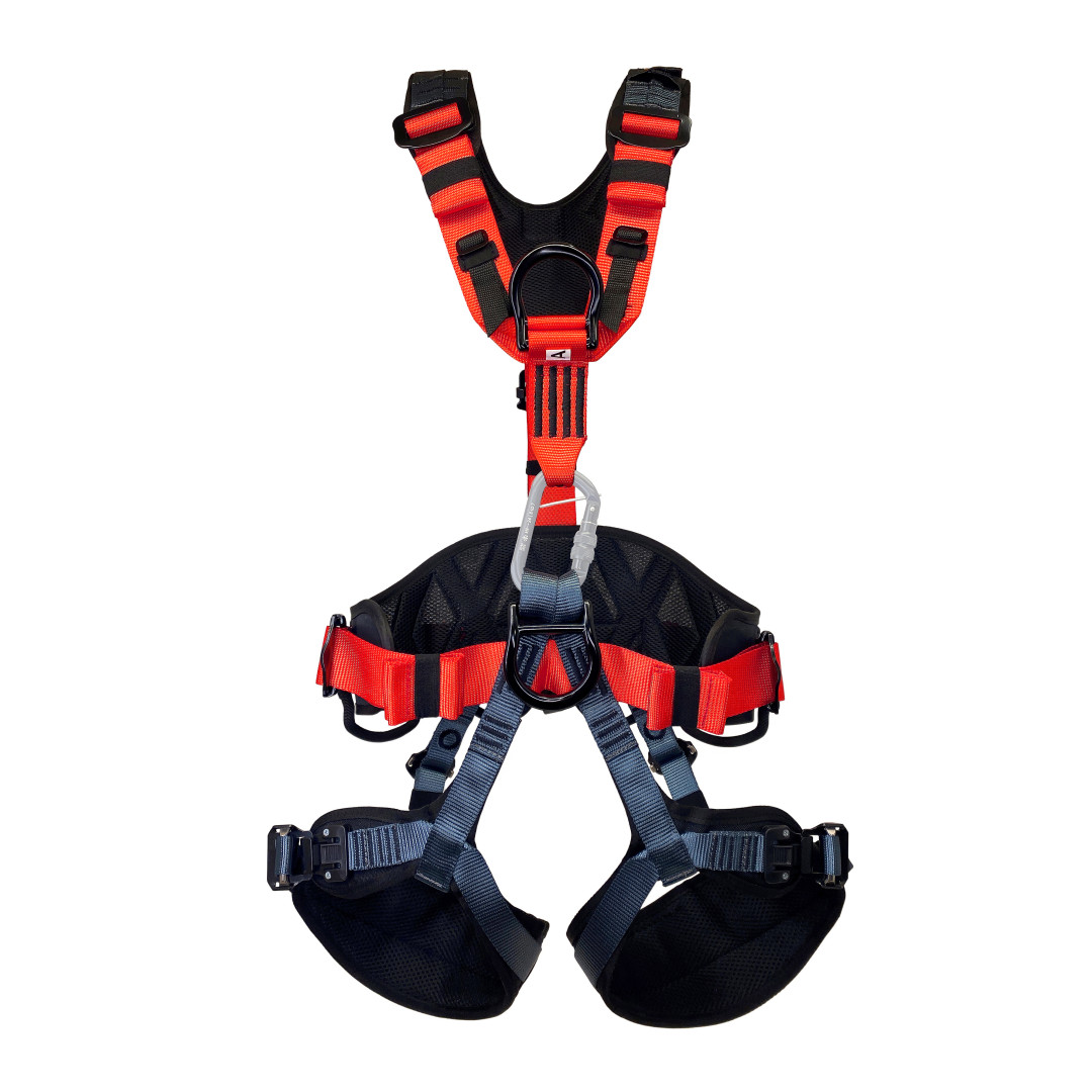 Страховочная привязь имеет 5 точек прикрепления: точка спереди на поясе для средств позиционирования, две страховочные точки А (на груди и на спине), 2 боковые точки для позиционирования.