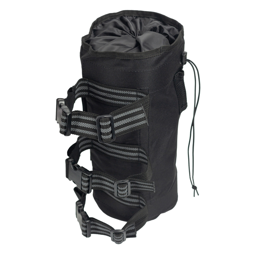 Сумка цилиндрической формы имеет внутренний каркас из жестких пластиковых пластин толщиной 2 мм, укладываемых в карманы из ременной ленты.